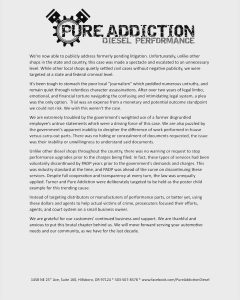 Another debacle in the diesel world has become public as Pure Addiction Diesel shares the news about their legal battle with CARB and the EPA. The image above tells the story best, but from what we can see a former employee decided to make life tough for the crew at Pure Addiction by lying to authorities, said authorities then took extreme advantage of the situation and went full speed at the shop tying them up in court for 2-years. It appears that yet again these cases don’t seem to be following any SOP, as this one is yet again vastly different than others in the past. We wish there was more transparency in these cases. Not knowing exactly how to navigate business or these lawsuits, is tough to say the very least. We wish the crew at Pure Addiction Diesel Performance all the best of luck and a speedy recovery from this unfortunate incidence.