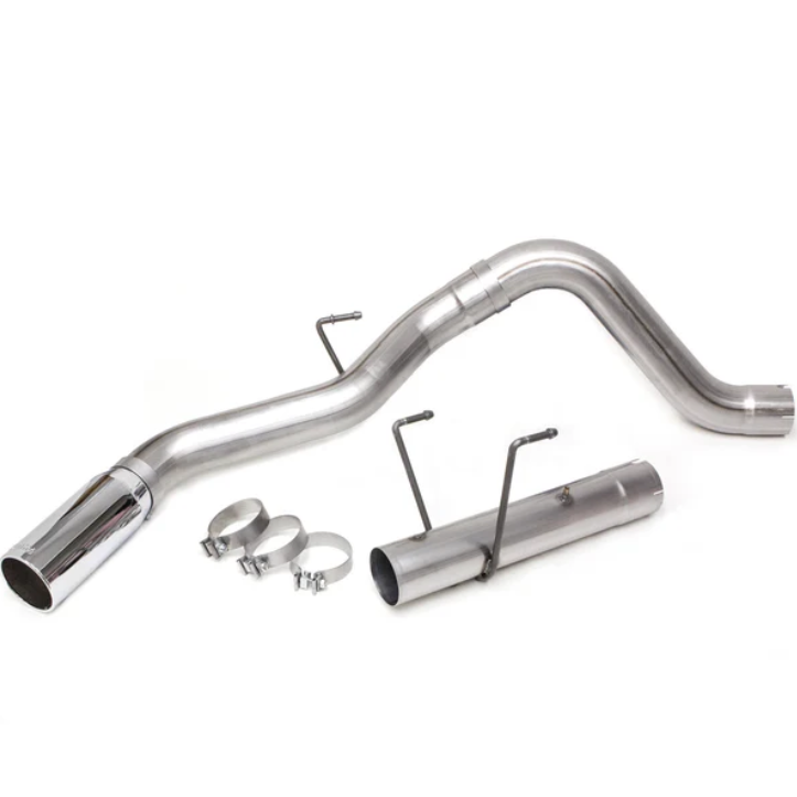 4-inch stainless mandrel-bent system. Safely clears spare tire. Huge polished Chrome Tip or Cerakote Black Tip.