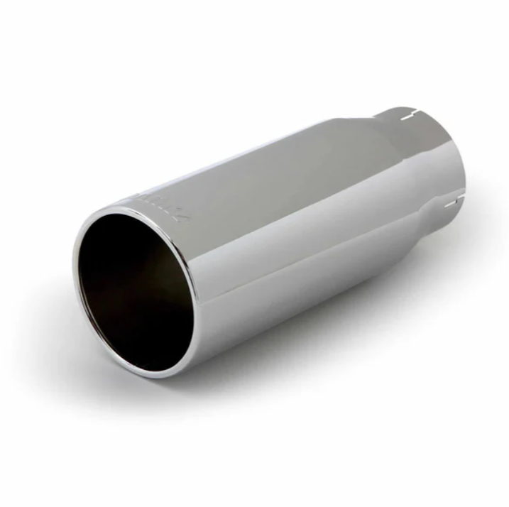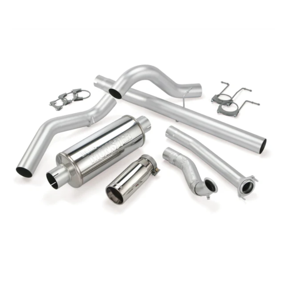 Huge 4-inch constant-diameter mandrel-bent stainless steel pipe outflows stock by 26 Percent. Straight-through muffler virtually eliminates backpressure. Retains factory catalytic converter. Includes Turbine Outlet Pipe and 5-inch Chrome or Cerakote Black polished tip.