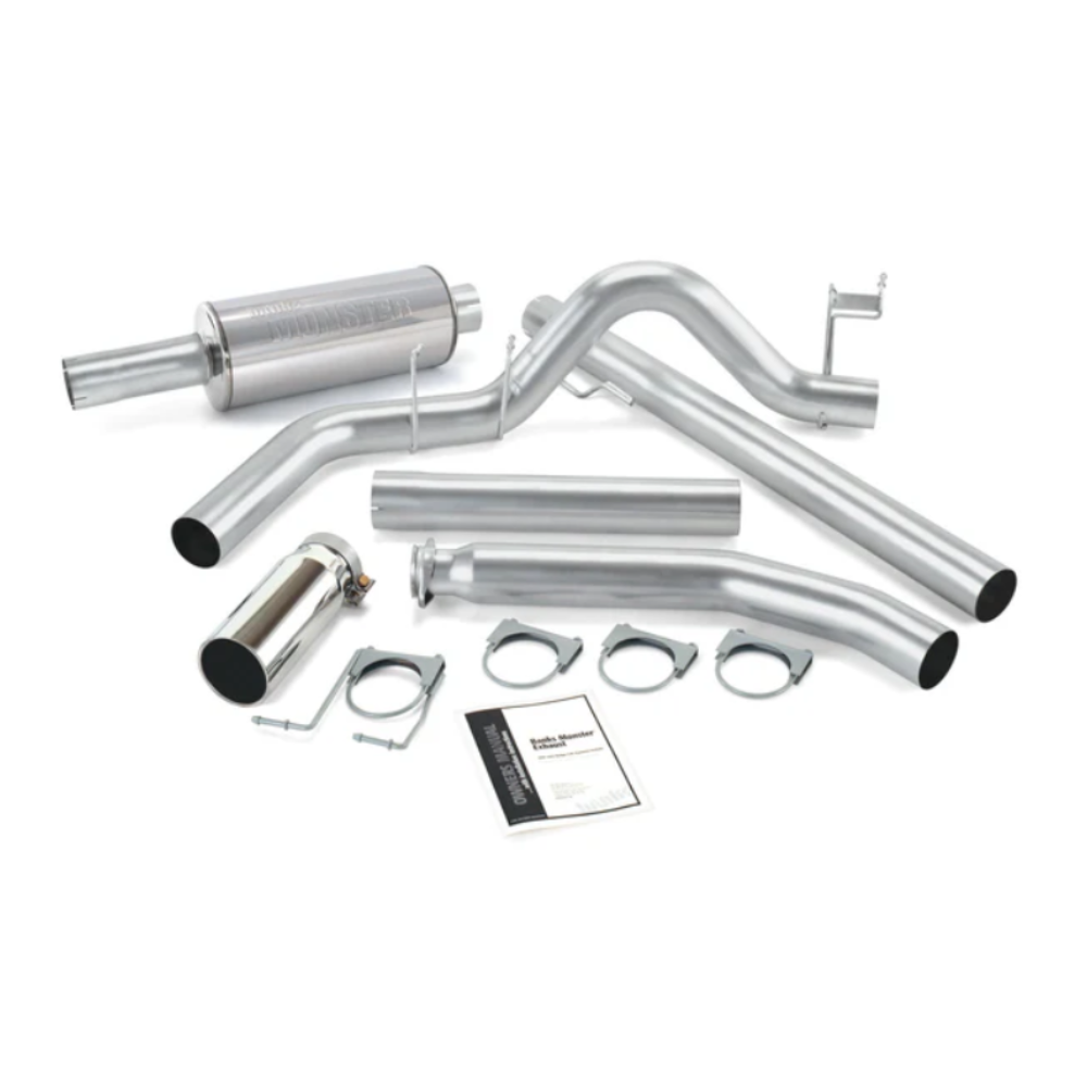 ISB Pickup: Constant-diameter to slash backpressure and lower exhaust gas temperatures, Banks Monster exhaust pipes bolt behind the turbocharger. The streamlined 4 inch turbine outlet pipe, head pipe, intermediate pipe and tailpipe are formed of stainless, heavy-wall tubing with constant-diameter bends to outflow stock and the competition. Banks replaces the factory’s restrictive muffler with a polished-stainless Monster muffler, featuring a straight-through 4 inch diameter flow-path with a Banks-designed expansion chamber to dissipate the annoying mid-range exhaust drone that plagues most straight-through mufflers. Muffler utilizes spun ceramic, very-high-temperature packing and delivers an authoritative – but never intrusive – exhaust sound. The huge 5 inch polished-stainless steel tailpipe tip sports a rolled edge. And to help keep it looking good, there’s a 1/2 inch air gap to keep heat from tarnishing the finish. An adjustable clamp lets you position it on the tailpipe just right.