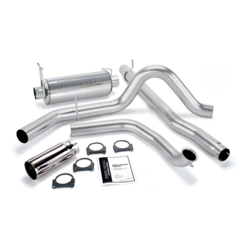 F-250 & F-350 PICKUPS and EXCURSIONS: Banks 4 inch Monster turbo-back stainless steel exhaust features streamlined turbine-outlet pipe, intermediate pipe and tailpipe all formed of stainless, heavy-wall tubing with constant-diameter bends to maximize flow, lower exhaust gas temps and slash backpressure up to 81%. (Available with or without a cast, large-bore Power Elbow housing). Designed for trucks without a catalytic converter. The polished-stainless Monster muffler features a straight-through 4 inch diameter flow-path with a Banks-designed expansion chamber to dissipate the annoying mid-range exhaust drone that affects most straight-through designs. The muffler utilizes spun ceramic, very-high-temperature packing, more than doubles stock exhaust flow, and delivers an authoritative – but never intrusive – exhaust sound. And the 5 inch polished rolled-edge tip has an adjustable clamp for positioning on tailpipe. Get it in your choice of chrome-over stainless or high temp black! (And to help keep it looking good, there’s a 1/2 inch air gap to keep heat from tarnishing the finish).