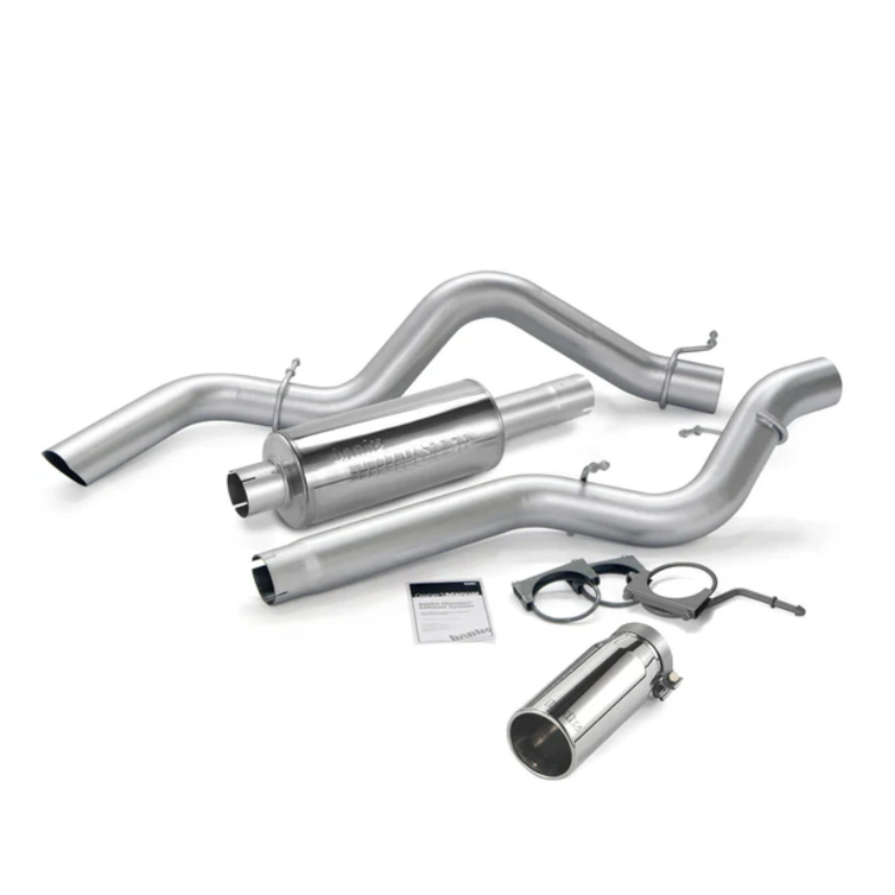 4 inch stainless constant-diameter pipes and straight-thru muffler improve flow up to 176 percent and lower EGTs, cuts backpressure up to 98 percent, rich authoritative sound. Banks 4 inch heavy-duty stainless Monster exhaust system cuts backpressure up to 98 percent and flows up to 176 percent better than stock. The streamlined intermediate pipe(s) and tailpipe are formed of stainless, heavy-wall tubing with constant-diameter bends to maximize airflow and lower exhaust gas temps. The polished-stainless constant-diameter muffler features a straight-through 4 inch diameter flow path with an exclusive expansion chamber to dissipate the annoying mid-range exhaust drone. Monster muffler utilizes spun ceramic, very-high-temperature packing, more than triples stock flow, and delivers an authoritative exhaust sound. Huge 5 inch polished-stainless steel tailpipe tip sports a rolled edge – plus, you get to pick whether you want a polished chrome-over stainless or high-temp Black tip! And to help keep it looking good, there’s a 1/2 inch air gap to keep heat from tarnishing the finish. An adjustable clamp lets you position it on the tailpipe just right.