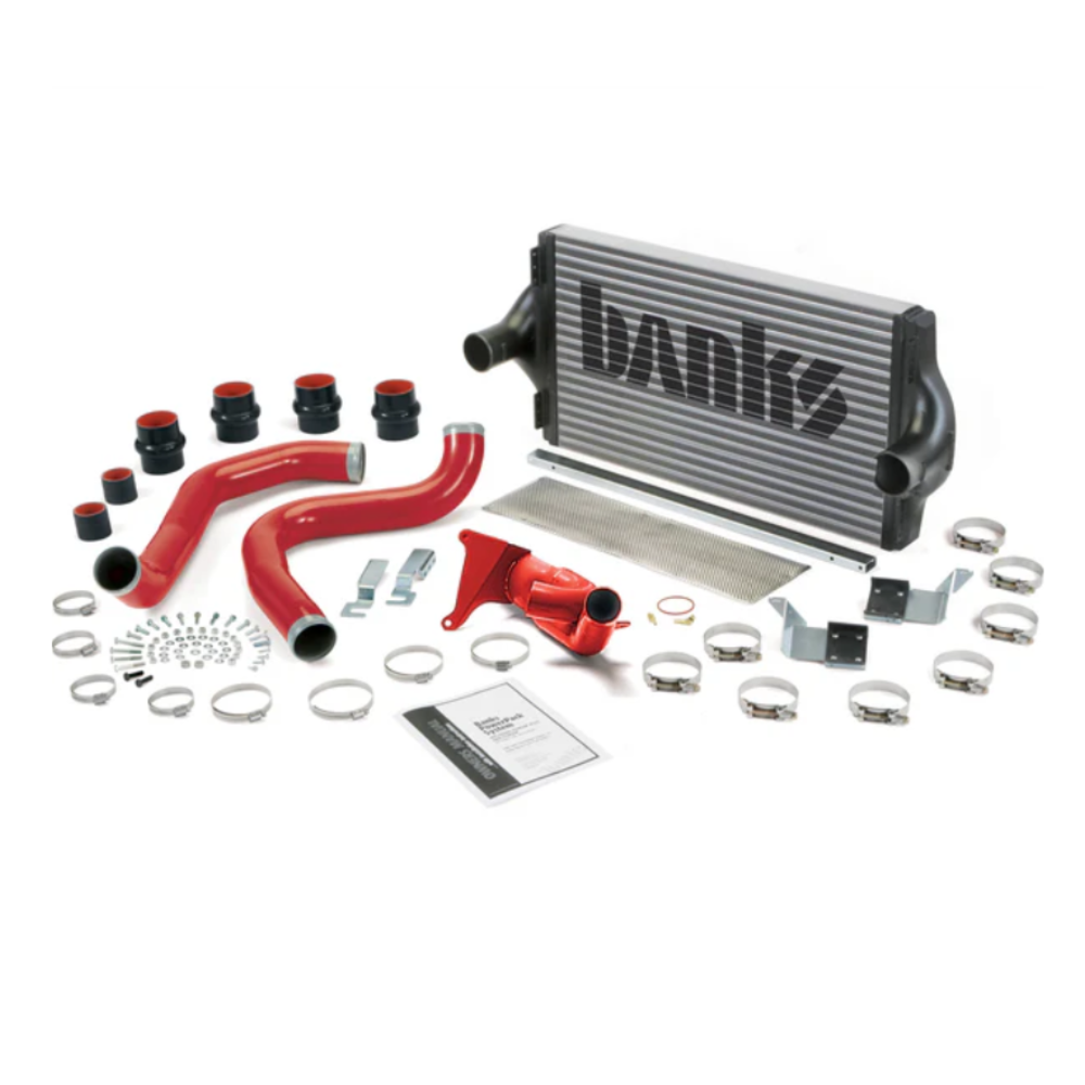 Banks Techni-Cooler Intercooler system includes mandrel-bent  3″  high-flow boost tubes … large, high-efficiency all-aluminum end tanks instead of the wimpy stock plastic ones that can rupture under high-boost conditions … a high-flow inlet that distributes air evenly across the intercooler for an  18%  increase in flow and more effective cooling … a wide-open outlet … and a thicker core area with impressive volume. Because the stock manifold inlet in early ’99 Power Strokes flows more air to one side of the cylinder bank than to the other, Banks developed an innovative Twin-Ram manifold inlet assembly that flows air equally to both sides of the engine for smooth, even power delivery.